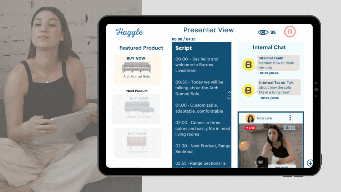 Anyone with a smartphone can livestream. Simply follow your script on Haggle's presenter view while streaming.